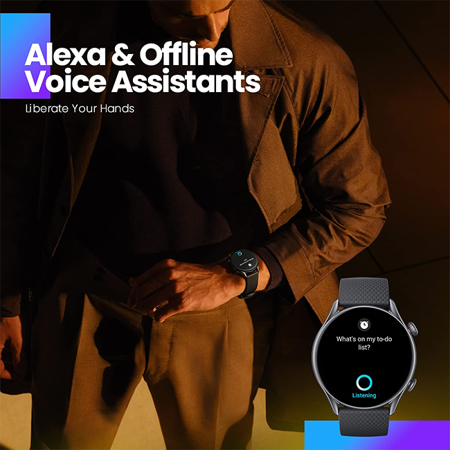 Vibrant Watch Faces & Always-on DisplaysMatch your mood, an outfit or the occasion with a wide selection of more than 150 stylish watch faces, all of which have a matching always-on display. Want a more high-tech feel? Step into the future and choose from 15 animated watch faces. Prioritize preferred features with 23 editable modular dials – or even upload your own photo as the background image for true personalization. | Receive Bluetooth CallsWhen you’re out for a walk, working out, or seeing friends, you can leave your phone in your pocket. Through Bluetooth connection to your phone, the Amazfit GTR 3 Pro smart watch can receive phone calls. | Alexa and Offline Voice AssistantEasily set an alarm, ask questions, get a translation and more with Alexa, which is built into the Amazfit GTR 3 Pro smart watch. If you’re out and don’t have internet access, the smart watch also has an offline voice assistant for you to perform operations like engaging a sports mode or opening a health metric feature via voice command. |