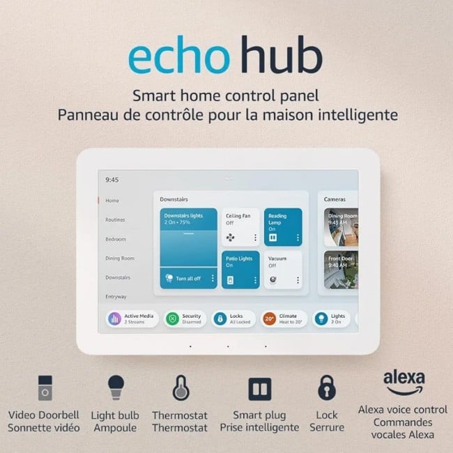 The Amazon Echo Hub 8 Smart Home Control Panel with Alexa is your all-in-one solution for managing and controlling your smart home devices. Featuring a vivid 8-inch smart display, it allows you to easily control lights, locks, thermostats, security cameras, and more — all from one central hub.