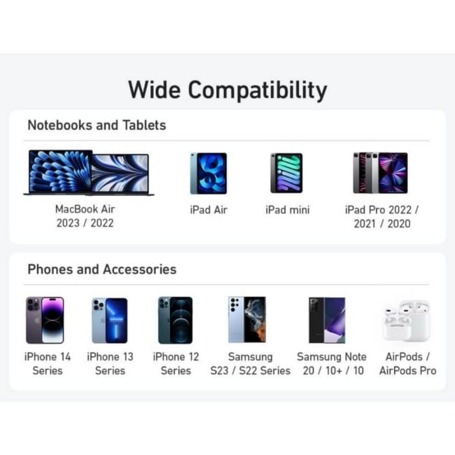 Support PD QC PPS charging technology. The max charging power up to 25W. Compatible with many devices, such as cell phones, ipads and MacBook air.