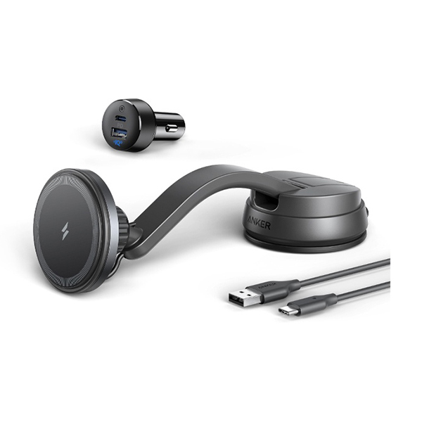 Anker 613 Magnetic Wireless Charger (MagGo), 2-port USB car charger, 5 ft (1.5 m) USB-C to USB-A charging cable, 4 cable clips (self-adhesive), and dashboard mounting pad (3M).