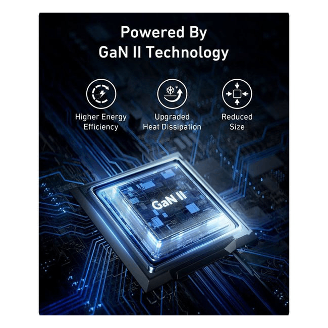 Powered by GaN II Technology: With a 100% increase in operating frequency, an innovative stacked design, and an upgraded circuit board structure, GaN II technology makes our latest charger smaller without sacrificing a drop of power.