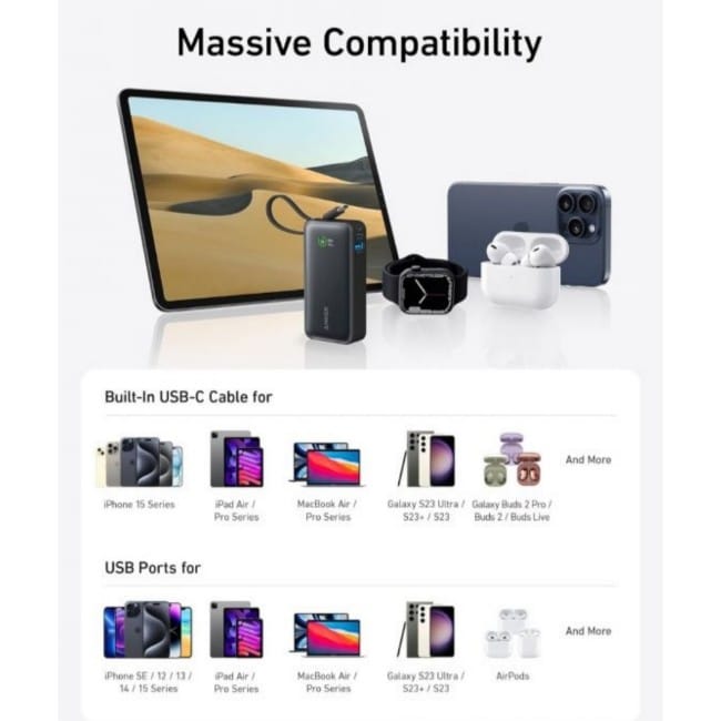 Built-in USB-C cable: Use the built-in USB-C cable to charge your smartphones, tablets and laptops as well as recharge the power bank itself – meets all your charging needs!