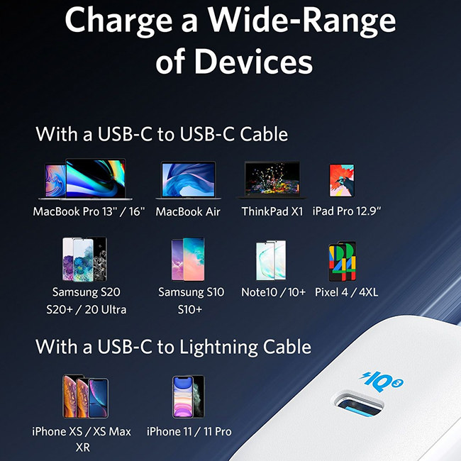 It is equipped with PowerIQ 3.0 technology to present optimized charging to almost all cellular devices, including cell phones, tablets, and laptops. It also supports Programmable Power Supply (PPS) for compatibility with Samsung Super Fast Charging.