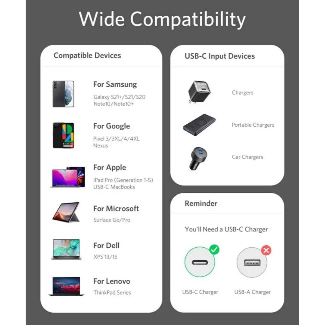 Fast Charging: Supports a max power output of 100W when paired with a 100W or above wall charger to power up virtually any USB-C device, including phones, tablets, and laptops. (This cable does not support media display.)