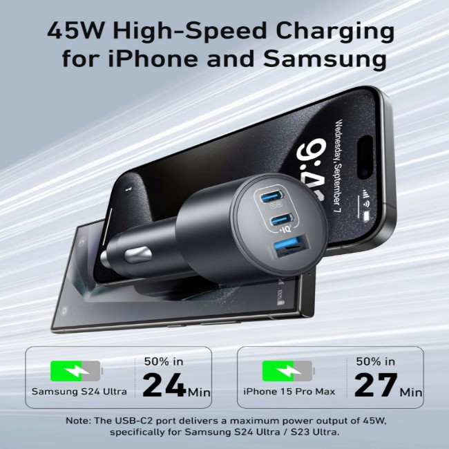 Reliable 45W USB-C2 Port: The second USB-C port offers 45W max of power, providing fast and reliable charging for iPhones and Samsung devices, keeping you connected without any delays.