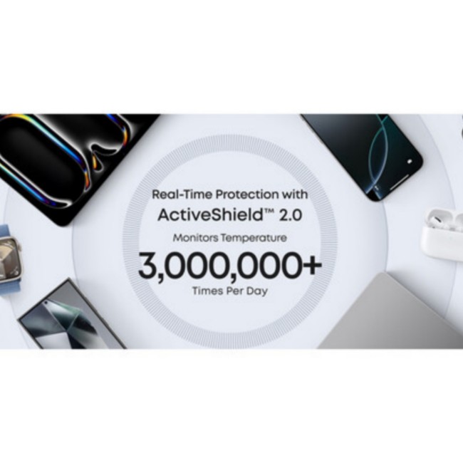 Supports simultaneous device charging with the built-in cable or port, offering up to 30W, alongside a wireless watch charger that provides up to 5W. The power bank fully recharges in 1.5 hours with a 30W maximum input.