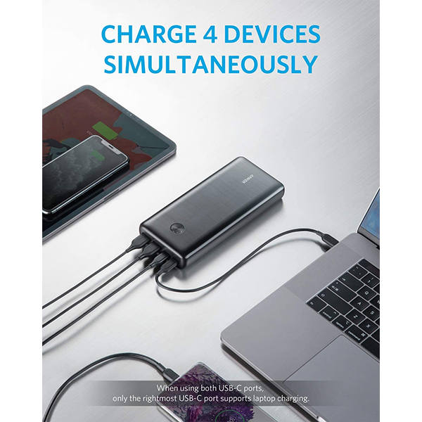 Colossal Capacity: With a huge 25,600mAh cell capacity, you can keep multiple devices charged for days at a time (25,600mAh is the total of the nominal rated capacity of internal battery cells ). Charge an iPhone 11 Pro Max 4 times, an iPad mini 5 3 times, or a MacBook Air 2020 once. Unrivaled Charging Options: Equipped with dual USB-C ports for a powerful 87W charge to a single device, or simultaneous high-speed charging to 2 devices. With an additional 2 USB-A ports, you can even charge 4 devices at the same time at a combined output of 78W. Universal Compatibility: PowerCore is built using Anker’s exclusive PowerIQ technology to ensure flawless compatibility with virtually any mobile device.