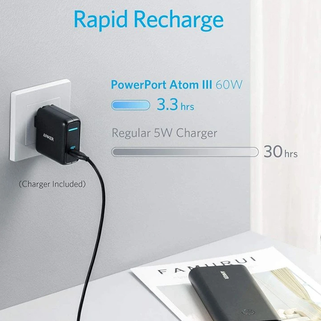 Use the included wall charger to recharge your PowerCore in less than 3 and a half hours via the USB-C Power Delivery port.
