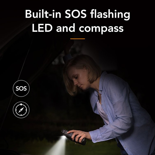 Light up the night with the high-intensity LED lamp, charge your phone with two high-speed USB ports, and find your way with the built-in compass.