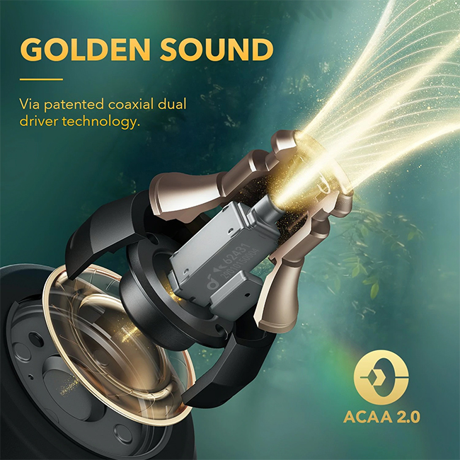 Our exclusive coaxial dual driver technology delivers high and low frequency sound directly to your ear without interference. Its wide soundstage is detailed and spacious, bass has a deep punch, mids are luscious, and treble sparkles.