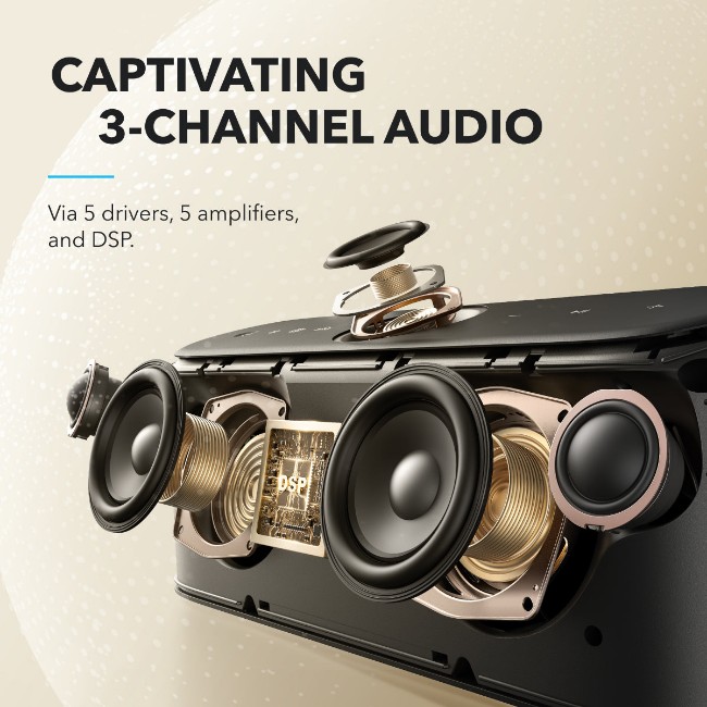 Anker SoundCore Motion X600 Bluetooth Speaker Immersive Spatial Audio: Inspired by theater acoustics, Motion X600 has 5 drivers and 5 amplifiers that are positioned to deliver sound all around you. Feel like you’re in the room with your favorite artist, every time you press play.