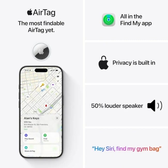 - Features: Precision Finding with Ultra Wideband, 50% louder speaker, Lost Mode with NFC contact sharing, share with up to five people, secure encrypted tracking via Find My network.