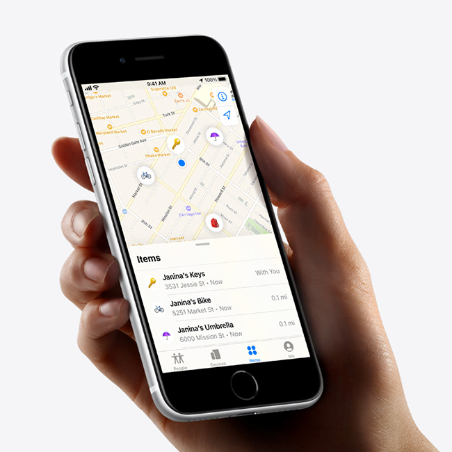 Your AirTag sends out a secure Bluetooth signal that can be detected by nearby devices in the Find My network. These devices send the location of your AirTag to iCloud — then you can go to the Find My app and see it on a map. The whole process is anonymous and encrypted to protect your privacy. And itʼs efficient, so thereʼs no need to worry about battery life or data usage.