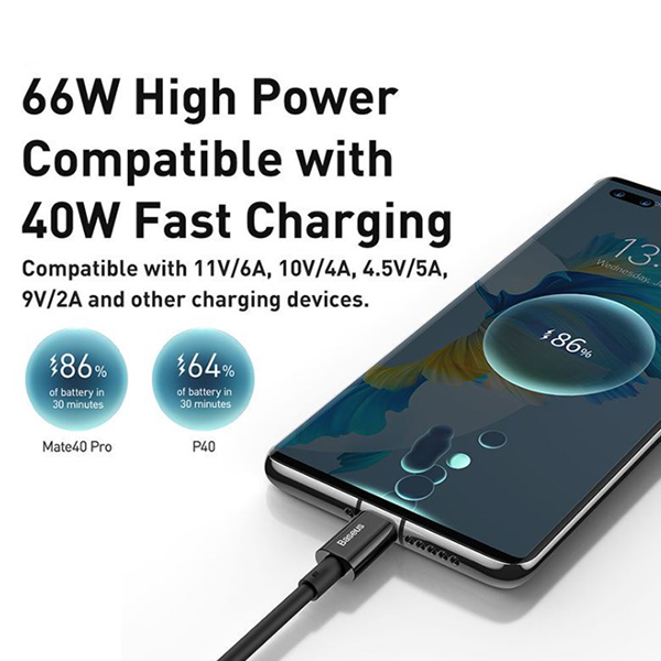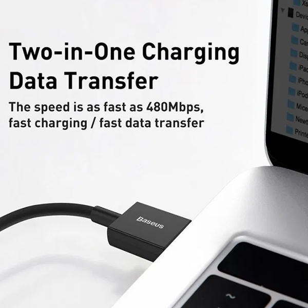 Quick charging and data transmission are possible thanks to cable USB-USB Type C 66 W. You can achieve perfect working parameters thanks to Baseus product which guarantees transmission speed of 480 Mbps. A 2-meters-long cable allows easy connection to power source and use of mobile phone while charging – no unexpected discharge risk.