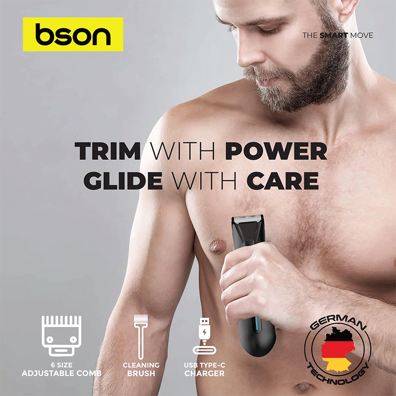 The Bson Sensitive Body Pro Trimmer is specially engineered for delicate skin areas, combining advanced features with thoughtful design. Its skin-secure jaw guards, sensitive-area blades, and protective housing help prevent nicks and irritation while giving you clean, even results. With six clipper/comb sizes included, you can customize your trim from ultra-short to moderate lengths with ease.