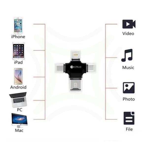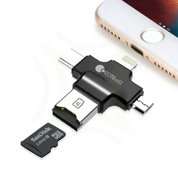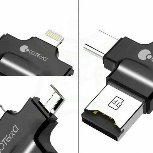FOUR IN ONE SD CARD READER COMPATIBILITY ? This Card Reader is great compatibility for all your devices. It has four interfaces: lighting connector for iOS devices; Micro USB connector for Android devices (with OTG) USB connector for computers/Macs; Type-C connector is for Type-C devices.