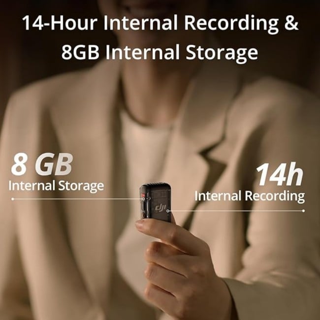 Internal recording of DJI Mic 2 cannot be used when the transmitter is connected to a smartphone via Bluetooth. Each transmitter has 8 GB of internal storage to store up to 14 hours of uncompressed 48kHz 24-bit audio.