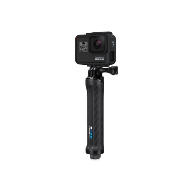 The GoPro 3-Way was designed to work as a camera grip, an extension arm, or a mini tripod. It features a collapsible design that measures 7.5″ when folded, and can be expanded up to 20″ when fully extend. The extension arm is foldable to help you get the right amount of reach, or it can be removed entirely if you just want to use the grip part. Tucked conveniently away inside the hand grip is a mini tripod that connects to the base, or even directly to your GoPro’s housing.