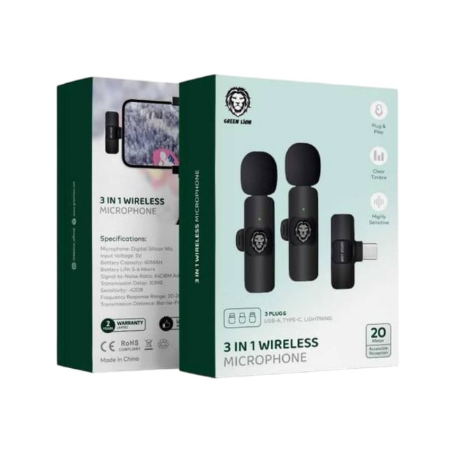 The Green Lion 3 in 1 Wireless Microphone is an advanced audio device, expertly designed for optimal sound clarity and broad compatibility. It features three distinct ports – USB-A, Type-C, and Lightning, accommodating various connectivity requirements and ensuring compatibility with various devices, including laptops, smartphones, and tablets.