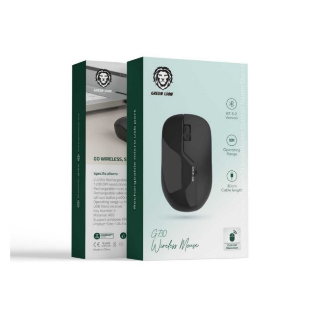Green Lion G730 Wireless Mouse is a rechargeable Bluetooth 5.0 compatible device with USB Nano receiver that has up to 10meters operating range gives you the chance to work remotely and freely.