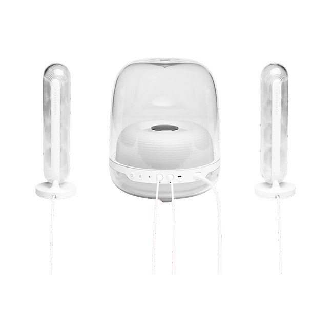 Harman Kardon SoundSticks 4 make a statement in any contemporary home. The groundbreaking transparent dome design and sleek silhouette blend in seamlessly with your decor. The two satellite speakers and subwoofer cover look stunning with an inner rippled surface design reflecting the beauty of music.