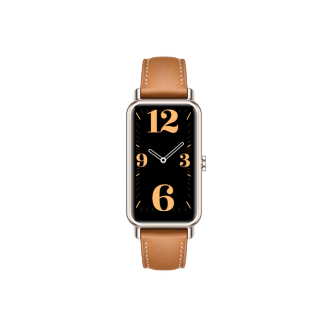 Attain true elegance of form with the classic rectangle design of HUAWEI WATCH FIT mini. Delight in the sleekly rounded corners and edges of the lightly gold-coloured metal case, and achieve timeless beauty in a smartwatch.