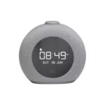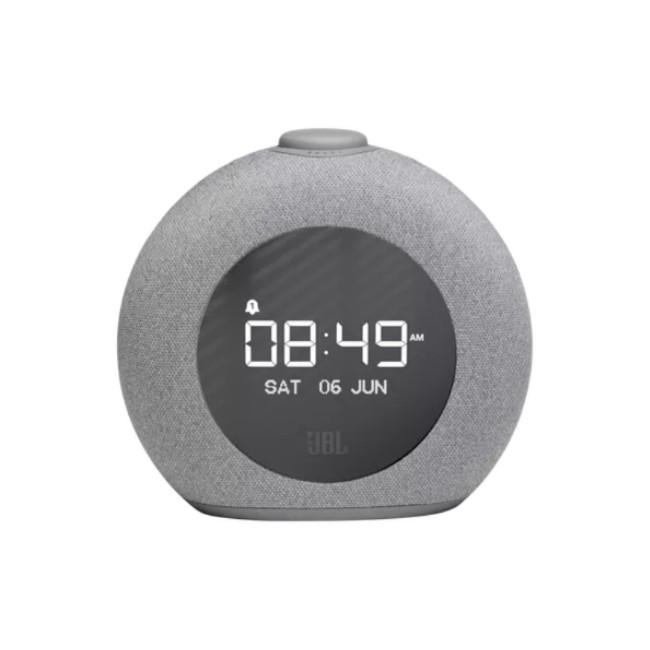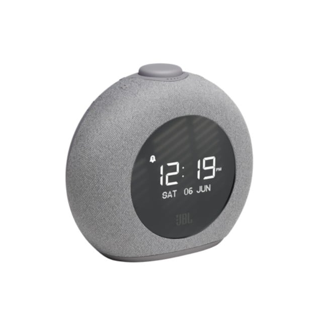 Wake up to JBL Pro Sound. With its signature round design, ambient LED light and FM radio, JBL Horizon 2 completes any bedroom. A large LCD display clearly shows the time, alarm settings and radio info, while the lifestyle fabric cover blends perfectly with any decor. Choose from a selection of alarm tones or one of your favorite FM radio stations. The easy-to-use rotary control knob lets you set and snooze alarms, adjust the volume or turn the ambient light on and off. Complete with two convenient USB ports for charging your devices, JBL Horizon 2 is the perfect bedside companion.