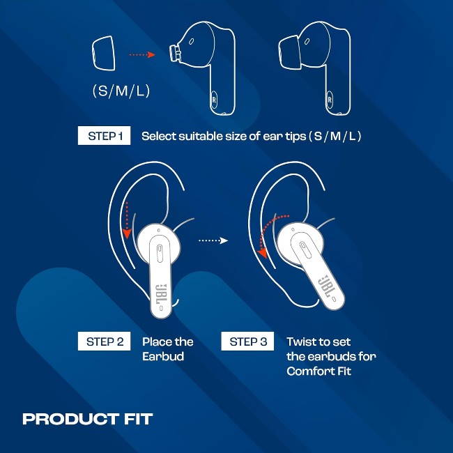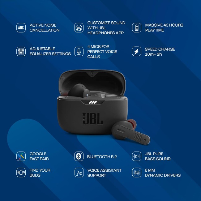 PERSONALIZE YOUR AUDIO WITH JBL HEADPHONES APP: Download the JBL Headphones app from Playstore or App Store and customize your Tune 235NC listening experience. Do more, be it Customizing your Noise Cancellation Setttings, Setting up Gesture Controls or Bass Boost from Equaliser Settings, Figuring out your best fit, Finding your earbuds or configuring your Voice Assistant – all from a few clicks on the JBL App.