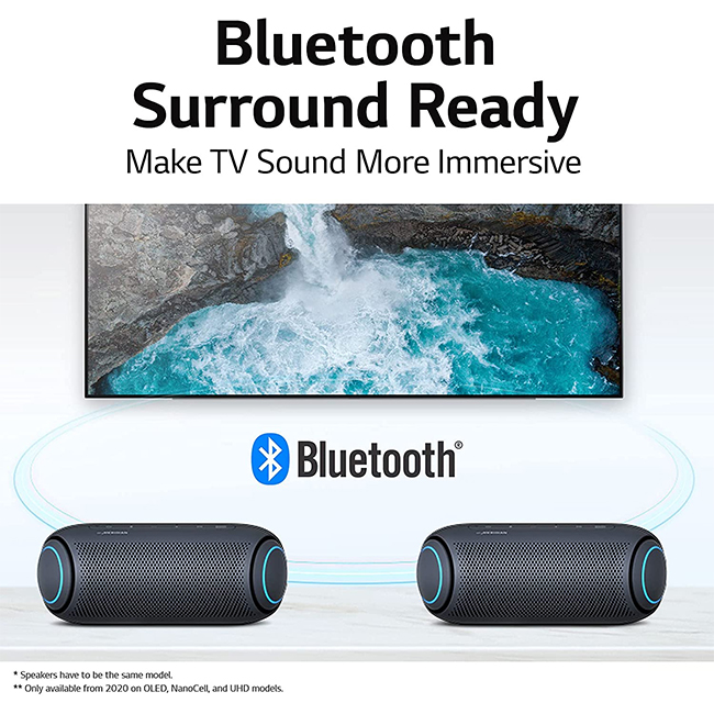 Add your LG XBOOM Go to your home theater. The portable Bluetooth® speaker easily connects to compatible LG TVs to add rear stereo or surround sound to all your favorite sports, movies and TV shows.