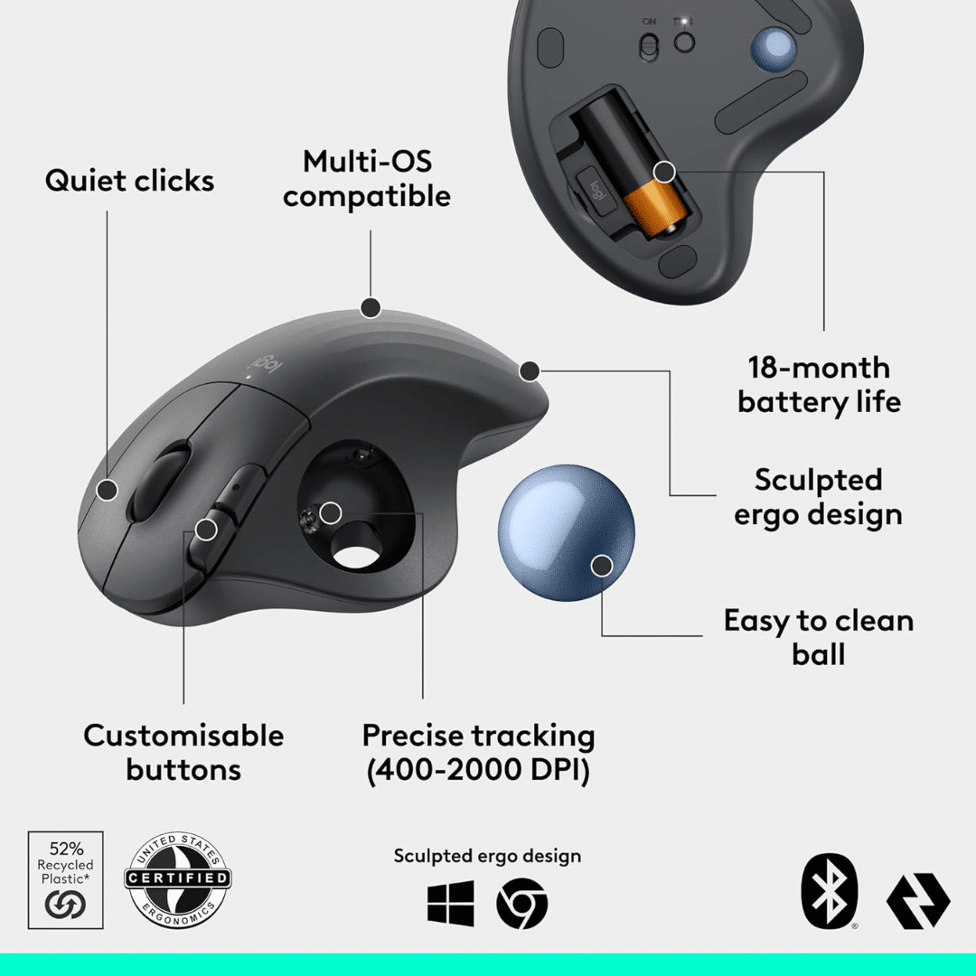 The Logitech Ergo M575S is a wireless ergonomic trackball mouse engineered to reduce hand, wrist, and forearm strain, making it ideal for long hours of office work or computer use. Instead of moving your whole hand and arm, you control the cursor using a thumb-operated trackball — this means your hand remains mostly stationary, which can help prevent repetitive-strain injuries and improve posture. The sculpted, ergonomically shaped body supports a relaxed forearm position, and the quiet-click design contributes to a calmer work environment. Dual connectivity (Bluetooth or USB receiver) provides flexibility across devices, while a long battery life and customizable buttons make it a practical tool for productivity. Overall, it’s tailored for comfort, efficiency, and reduced muscle strain in everyday computing.