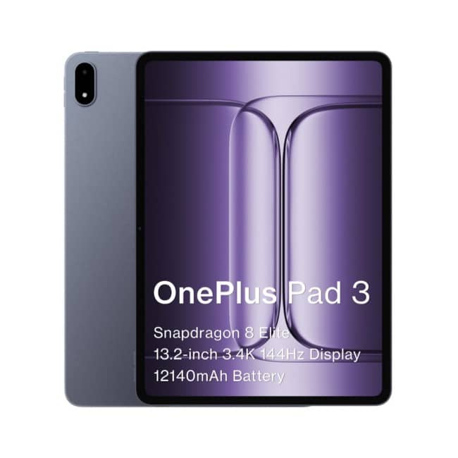 The OnePlus Pad 3 is a flagship Android tablet featuring a 13.2-inch 3.4K display with a 144Hz refresh rate, powered by the Snapdragon 8 Elite mobile platform and running Android 15. It has a large 12,140 mAh battery with 80W fast charging, an ultra-slim metal unibody design, and advanced AI features,
