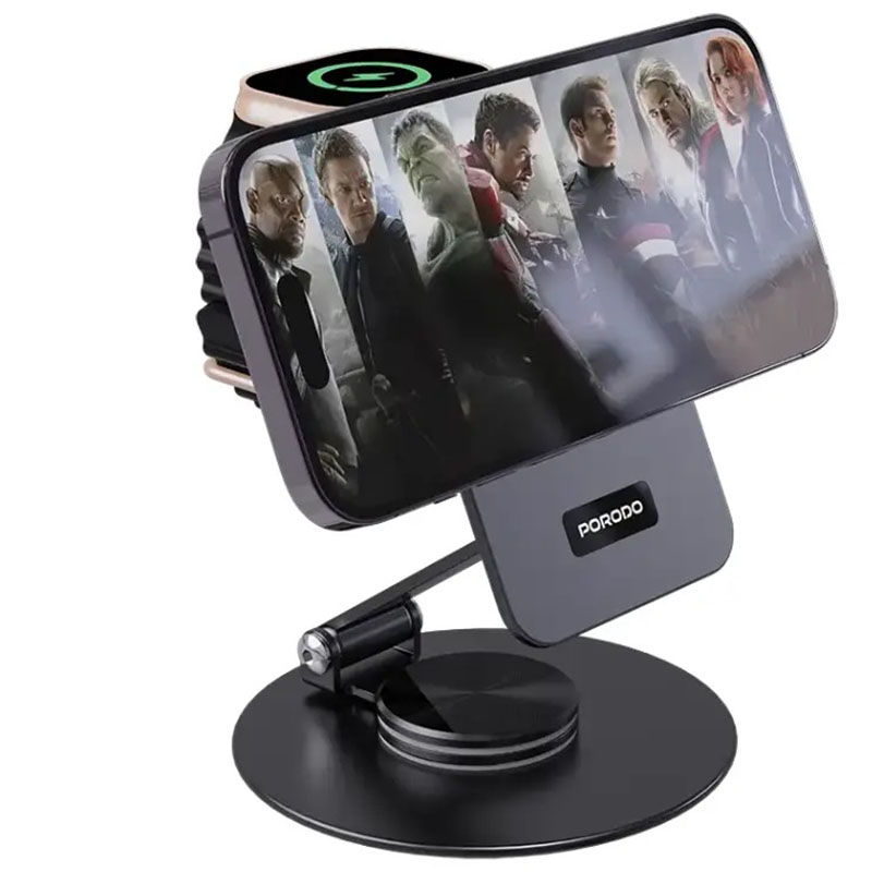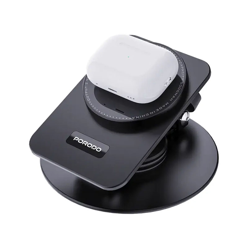 Users can enjoy the efficiency of charging multiple gadgets simultaneously thanks to the new Porodo wireless rotating stand. This modern Pordouc is available in a 9V/2A version, which includes different types of wireless charging outputs: 5W, 7.5W, 10W, and 15W for mobile phones, 3W for smartwatches, and 5W for earbuds. While working or taking a break, a comfort zone is assured, thanks to the progressive angles. Versatile use is also enhanced by the feature of the 360-degree rotating base, as it can be positioned in any space effortlessly. There is more to this, like the charger for folding watches, which is good for usability and ease of carrying. This stand is made stylish and well-balanced and functions very well, and it is an excellent choice for those who have much aversion to messy charging stations. Make charging a joy by getting this stylish, unique charging accessory