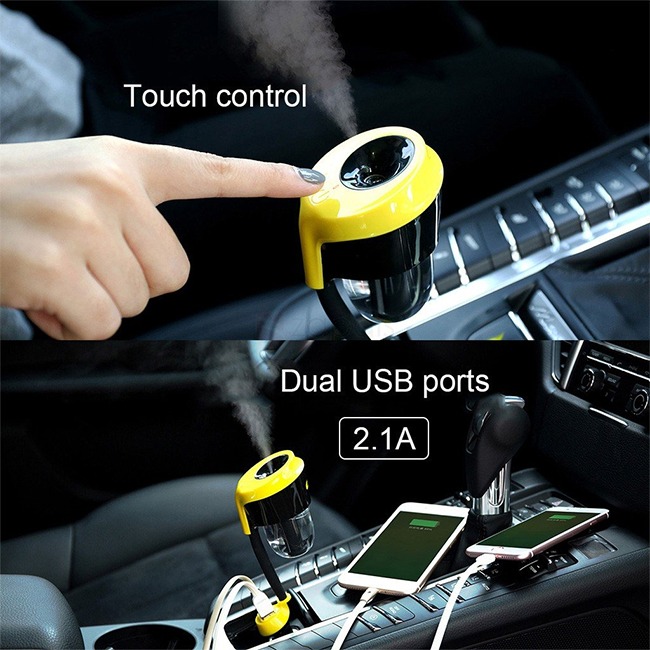 This humidifier provides a cool mist and adding moisture to the air, also effectively eliminates dryness, helps you with the issues of dry chapped skin, lips, sinuses, and coughs. The 113KHz frequency wave comes from humidifier the makes water divide into 6um super small drops to increase the air humidity. Mixed with the essential oil, it is able to make your car with full aroma. Comes with two USB ports, this car humidifier is able to charge two of your USB enabled digital devices at the same time. The charging current would automatically adjust and the maximum output is up to 5V / 2.1A.
