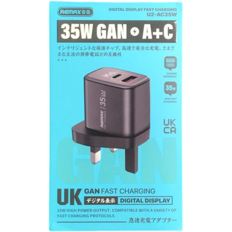 Remax U2-AC35W 35W GaN Digital Display USB-A + USB-C UK 3 Pin Fast Charger