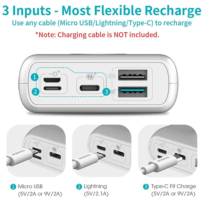 18W Rapid Recharge 3-Input: It only takes 7 hours to fully recharge the 20,000mAh power bank with a 18W wall charger. Featuring 3-input: Micro-USB,Apple Port,Type-C provides high convenience of recharging this power bank with any of these 3 widely used cables. (Note: 18W wall charger is NOT included.)