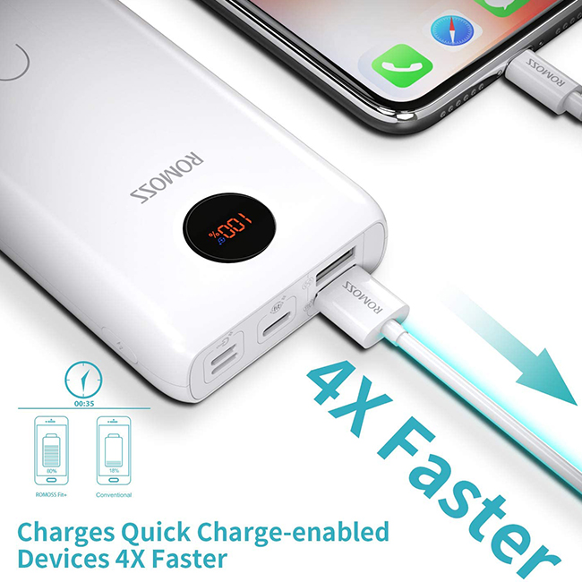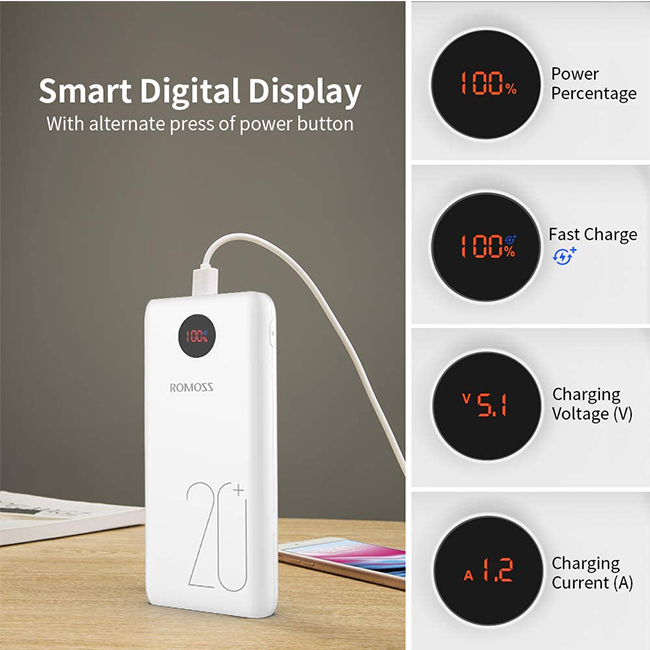 Portable with Power Display: The new architecture design of Romoss make it smaller than the equivalent capacity of 20000mAh.LED display not only has the power display function,battery percentage+Charging voltage+Charging current,when entering the fast charge state,it will display the blue light Fit+ logo.