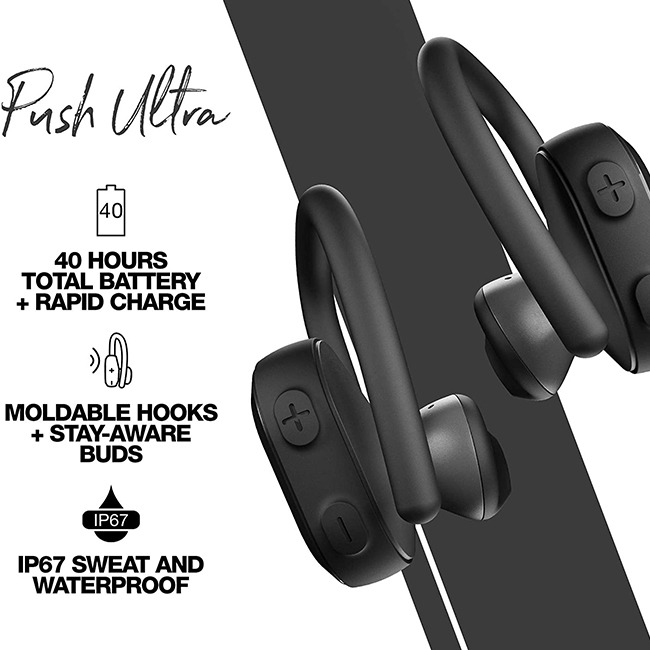 Push Ultra earbuds redefine freedom. Freedom to move, sweat, explore and take your music farther than ever. And with up to 6 hours of playtime (and 34 more in the case), that?s pretty far.