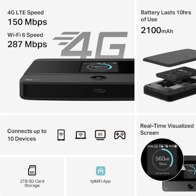 - 4G LTE supported with up to 150 Mbps download and 50 Mbps upload speeds