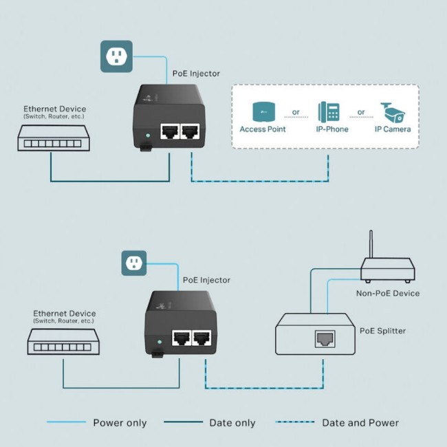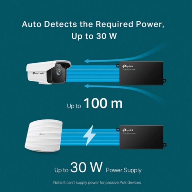 Power devices such as IP cameras, VoIP phones, and access points with the black TL-POE160S PoE+ Injector from TP-Link. This unit will support devices that require up to 30W of PoE. It complies with IEEE 802.3af/at standards and supports 1000 Mb/s passthrough data rates. The TL-POE160S can be wall mounted or placed on a desktop for flexible installation options.