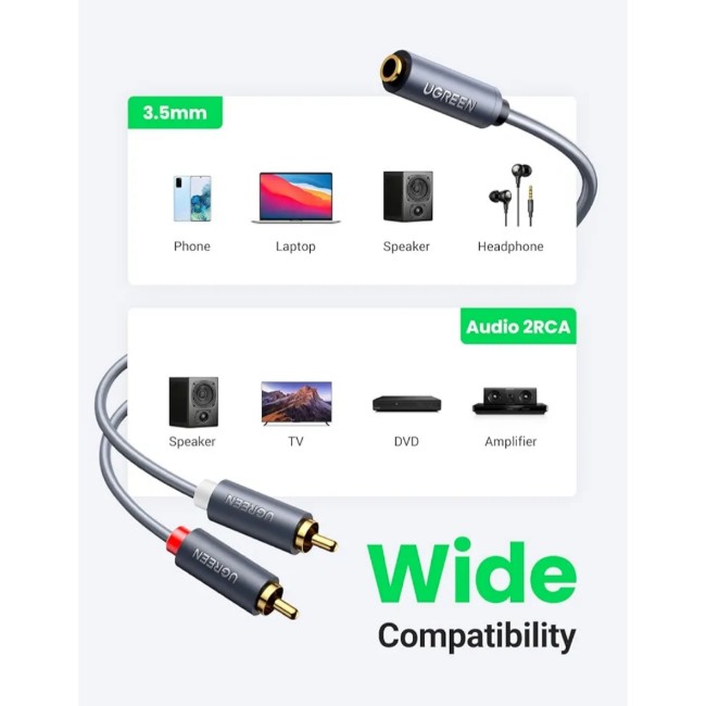 3.5mm Female to 2 RCA Audio Cable: UGREEN 3.5mm to dual RCA male cable streams Hi-Fi stereo audio from devices of aux port to devices of Red and White(L/R) port with an extra 3.5mm male to male cord, like connecting laptop to amplifier, TV to soundbar, DVD player to speaker, DAC to turntable. The 1/8 Aux female to red and white wire would offer a remarkable stereo sound experience to you