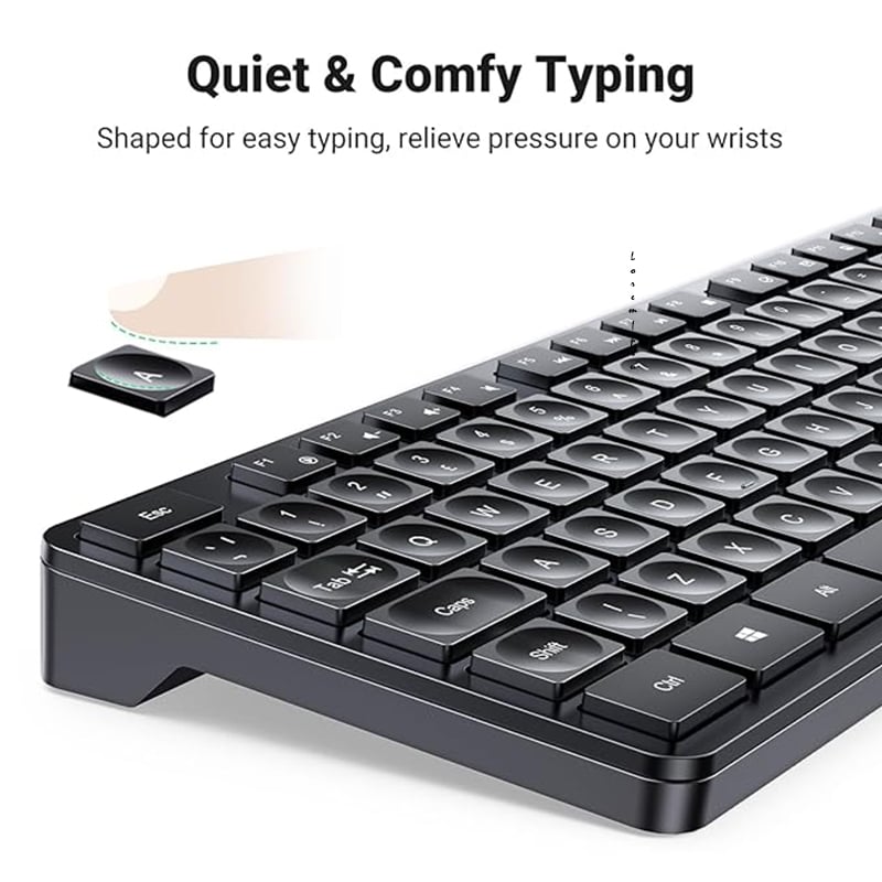 Noiseless Type and Click, Silent Play and Work The wireless office keyboard and cordless mouse has a noise reduction design to create a quieter environment for you.Light and responsive tactile keystroke make typing and clicking soft and comfortable. Never worry about disturbing others to rest while working or playing.