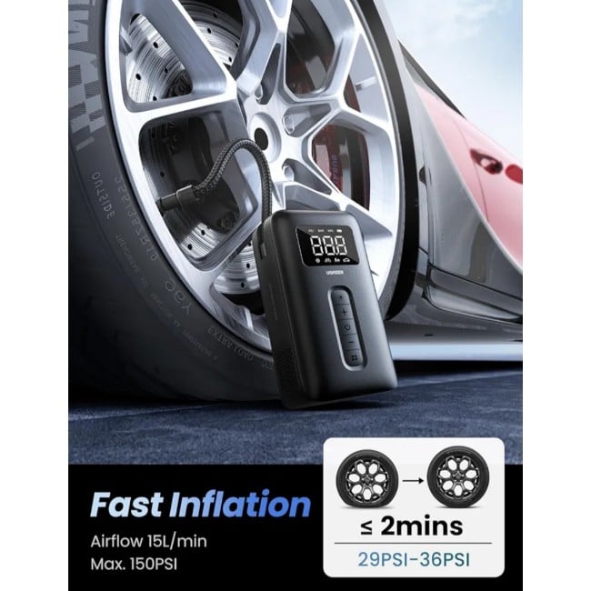 Fast Inflation: The powerful tire inflator can quickly inflate tires, it can provide a maximum pressure of 150PSI and airflow of 15L/Min. Which fills a small car tire up(20-36PSI) in 2 minutes and fully inflates bike tires(0-45PSI) in just 3 minutes.