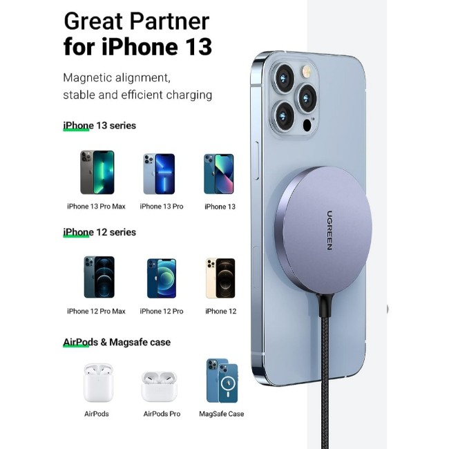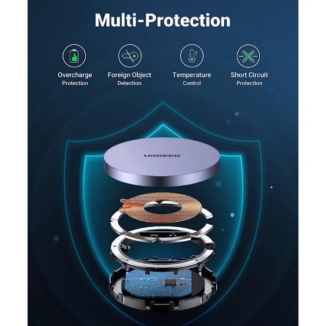 Safe and Reliable: The magnetic wireless charger is equipped with a high-quality metal plate and a fireproof PC cover, plus an intelligent chip to protect against short circuits, over-voltage, over-heating, and over-current.