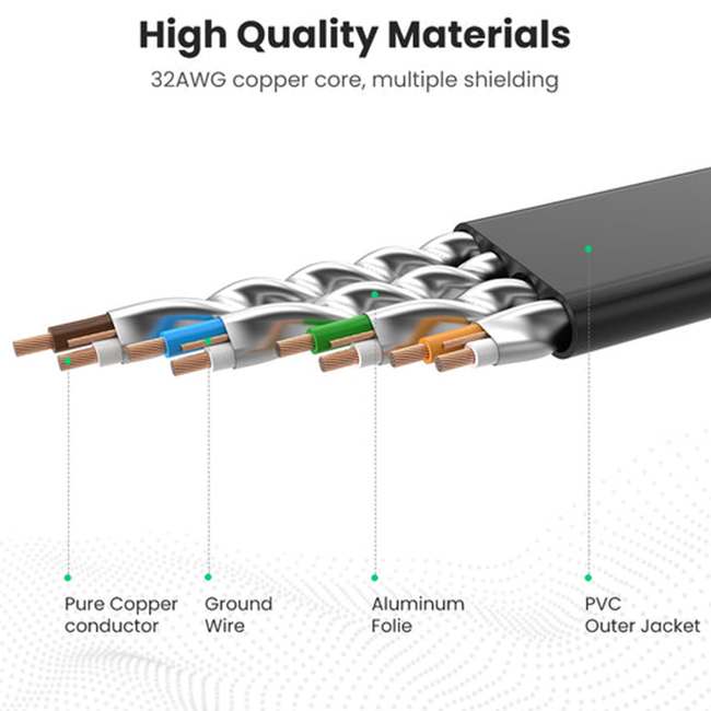 RJ45 patch cable are Made of 4 shielded twisted pair (U/FTP) of copper wires with two RJ45 connectors on each end. Compared to the Cat 6 network Ethernet cable, the additional shielding and improved quality in twisting of the wires provides better protection from crosstalk, noise, and interference that can degrade the signal quality.