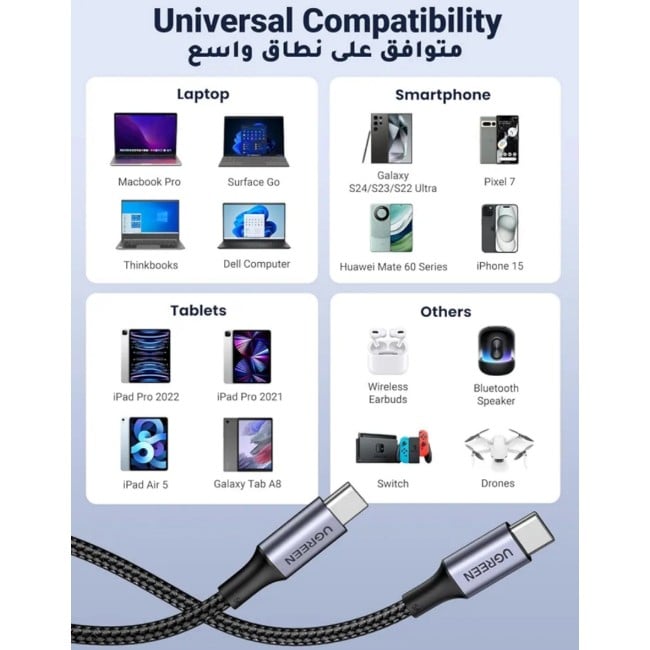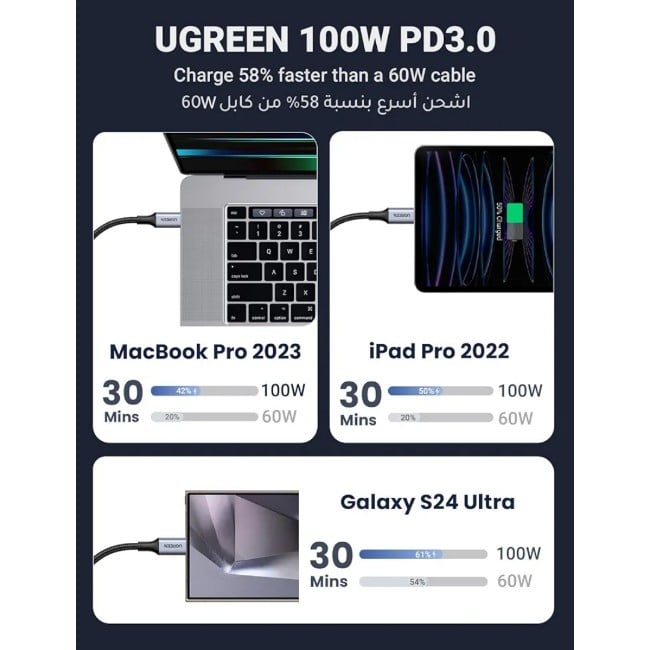 100W Fast Charger: UGREEN USB C to USB C charger cable can deliver power up to 100W (20V/5A), which charges 58% faster than a 60W cable; This 100W USB C cable can fast fuel your Galaxy S24 up to 60% in 30mins, and Macbook Pro 16 can be charged to 70% in 1hr; Say Goodbye to waiting, and enjoy your efficient life. PLEASE NOTE: This type-c to type-c cable only supports charging, not supports data transmission and video output.