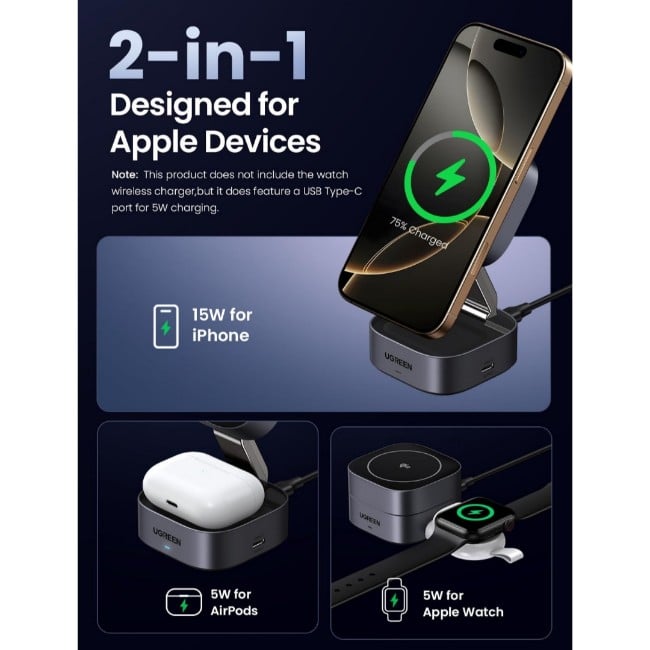 Rapid Power Combo: This UGREEN iphone wireless charger stand enables you to fast charge your iPhone and AirPods simultaneously, equipped with a USB-C port reserved on the right side, the watch or other device can be charged through a charger or C-C cable (sold separately). NOTE: maximize charging efficiency of the 2-in-1 wireless charger by using a Type-C PD 30W charging adapter or greater (not included)