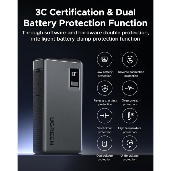 Comprehensive Safety Features: Equipped with advanced safety protections, the UGREEN jump starter safeguards against reverse connection, reverse charging, short circuits, high temperatures, overcurrent, overvoltage, undervoltage, and low battery conditions, ensuring safe and reliable operation.