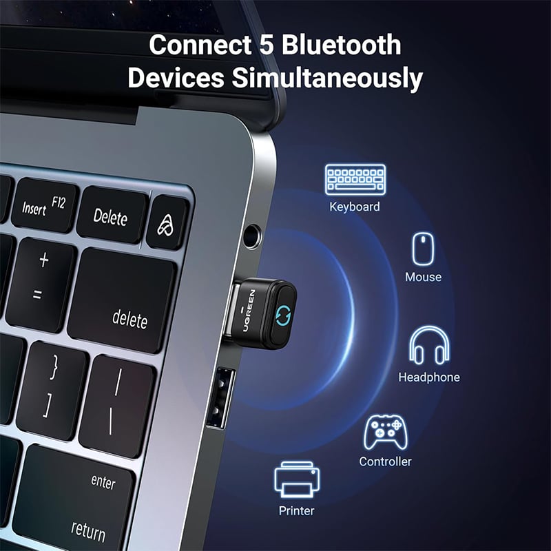 Up to 5 Devices Sync Connected: UGREEN Bluetooth dongle for PC supports up to 5 different types of Bluetooth devices to be connected at the same time without interfering with each other, such as Bluetooth mouse/keyboard/mobile phone/headphones, etc. If Bluetooth audio devices of the same type (such as speakers/headphones) are connected, only one device can play music