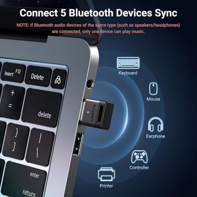 Up to 5 Devices Sync Connected: UGREEN Bluetooth dongle for PC supports up to 5 different types of Bluetooth devices to be connected at the same time without interfering with each other, such as Bluetooth mouse/keyboard/mobile phone/headphones, etc. If Bluetooth audio devices of the same type (such as speakers/headphones) are connected, only one device can play music.