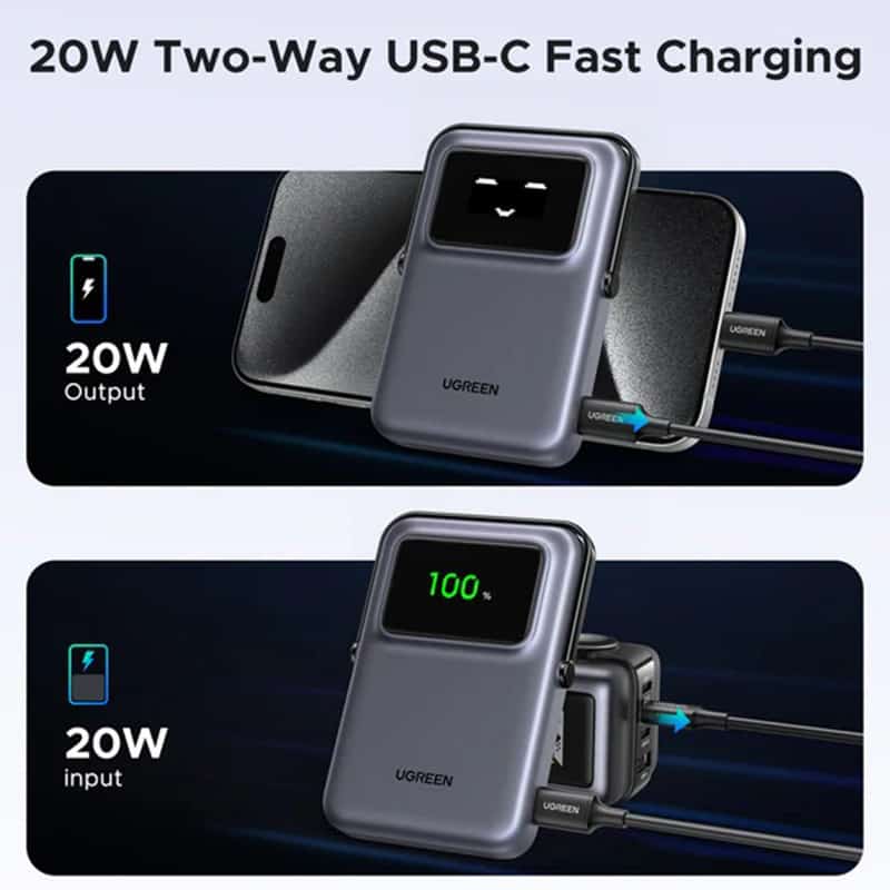 Wireless and Wired Charging: Ugreen battery bank offers 7.5W magnetic charging, while also supporting PD 20W wired charging. It combines convenience and power to ensure you can power two devices at the same time